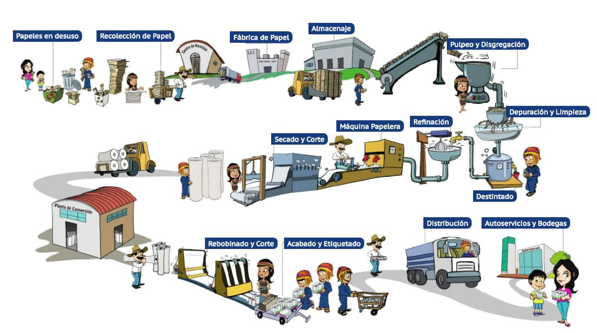 Luego se pasa la pasta de papel a la maquina que se encargara de fabricar las laminas de papel, este proceso es por etapas como afinamiento de la pasta, pasa por la prensa, luego se seca para pasar al bobinado del papel y es alli donde ya el producto esta listo para ser utilizado en la fabricacion de nuevos productos