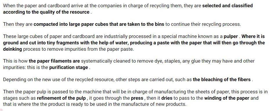 Cuando el papel y el carton llegan a las empresas encargadas de reciclarlas, estos son seleccionados y clasificados segun la calidad del recurso.